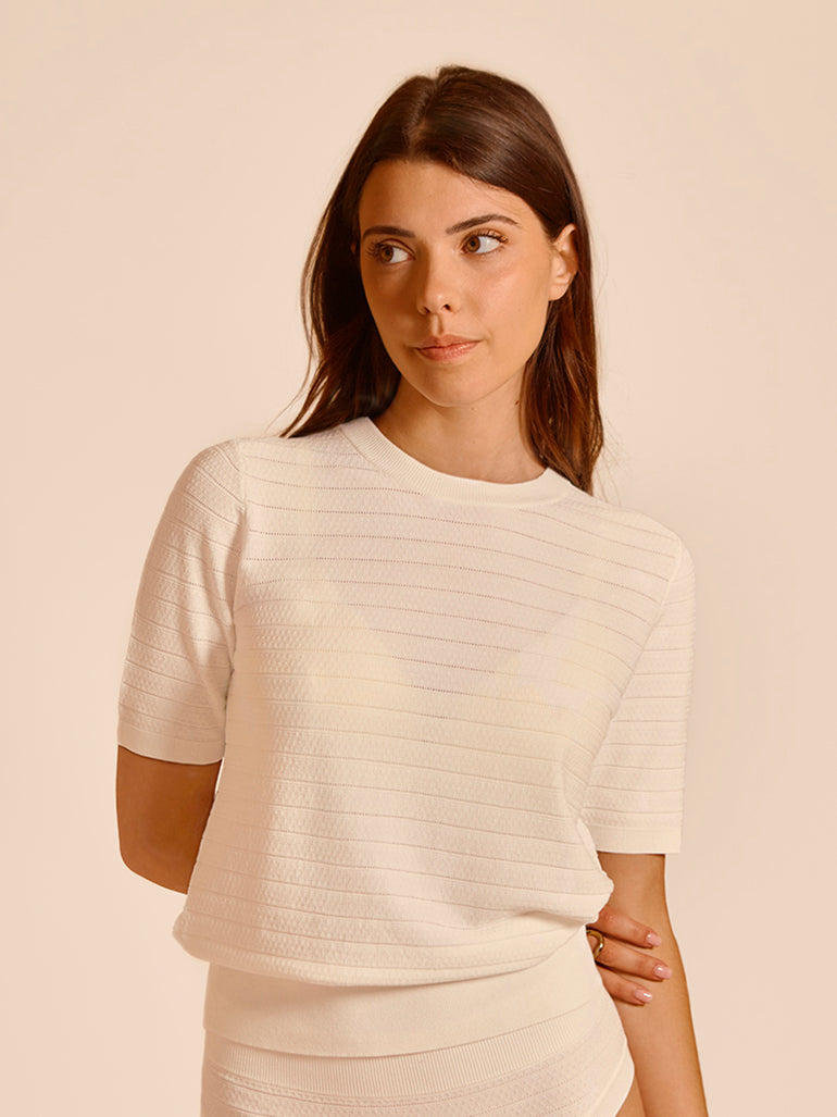 Refined simplicity, the Pollen Short Sleeve Night Top is understated yet undeniably elevated. Made with LENZING™ ECOVERO™ viscose knit that sits close to your body, this lightweight, short sleeve top offers the perfect balance of coverage and breathability. The delicate pointelle openwork detailing and cream colour elevates the minimalist design to add a touch of modern French elegance to your days out or nights in. The seamless integration of comfort and style makes this piece a versatile wardrobe staple, equally effortless paired with high-waisted denim or the matching Pollen Night Pant for a comfortable and chic loungewear set.