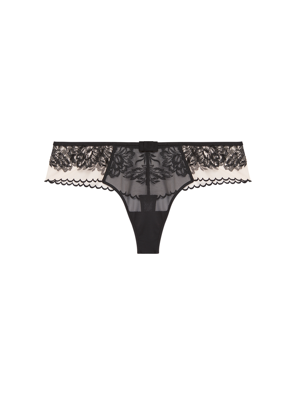 - Black floral embroidery on sheer nude tulle