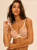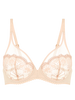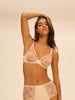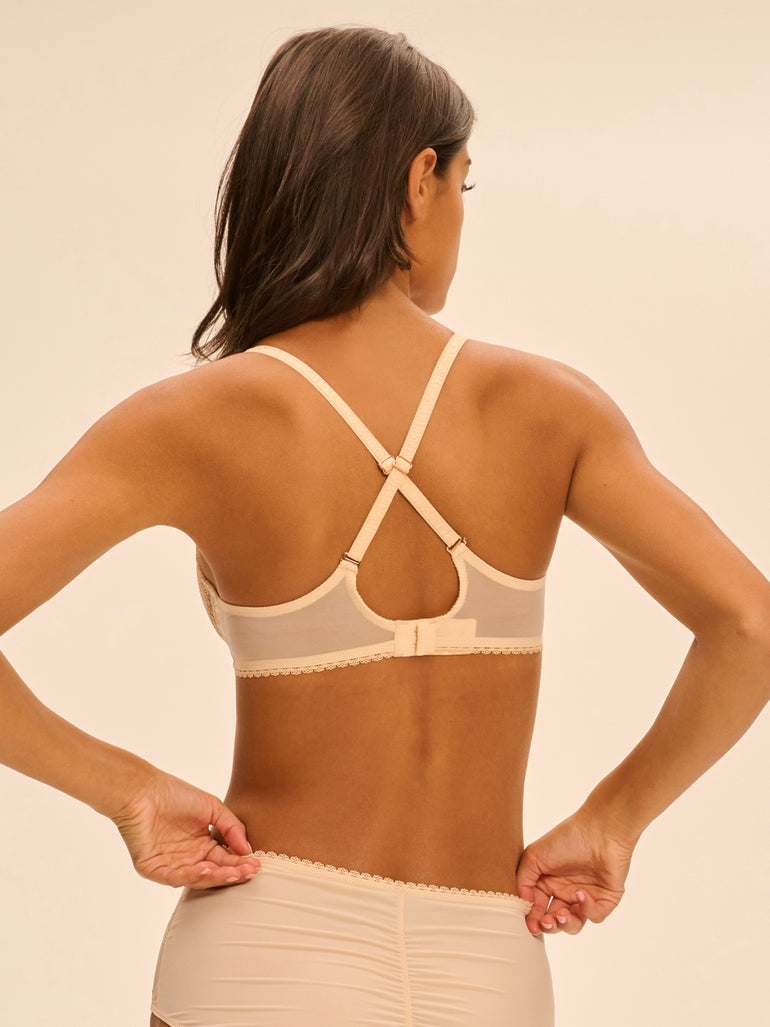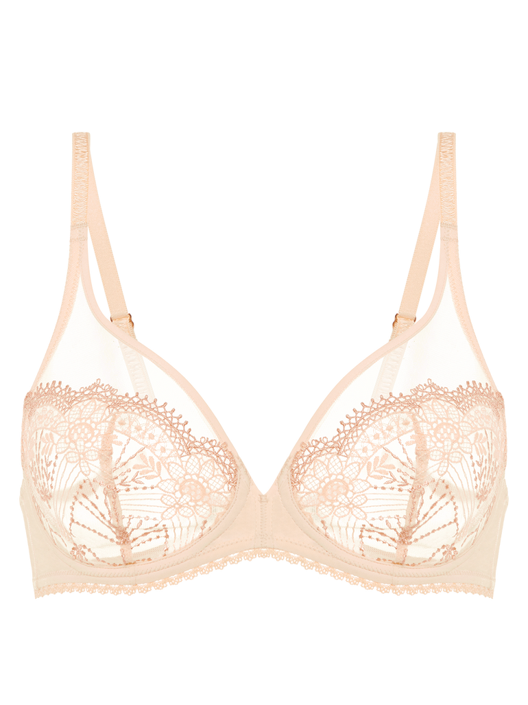 - Lower cups in embroidery with vertical dart and upper cups in transparent tulle (lined with stiff tulle from D cup)