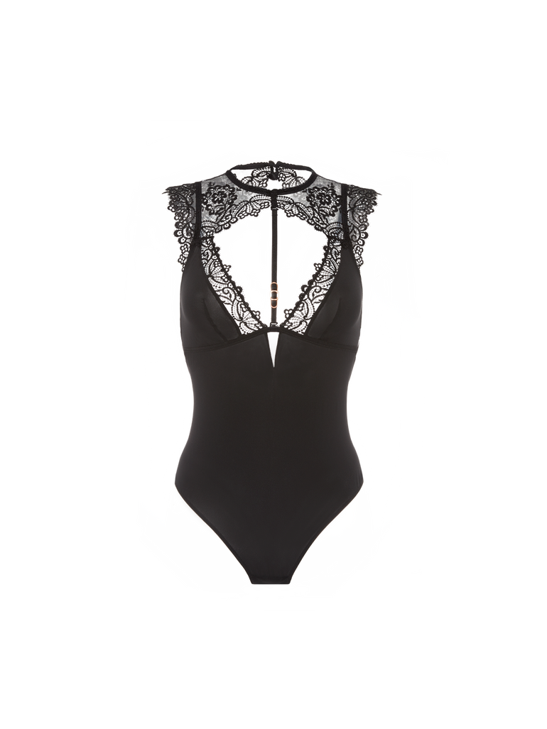 - Wireless triangle bodysuit in embroidery, lace, and knitted fabric