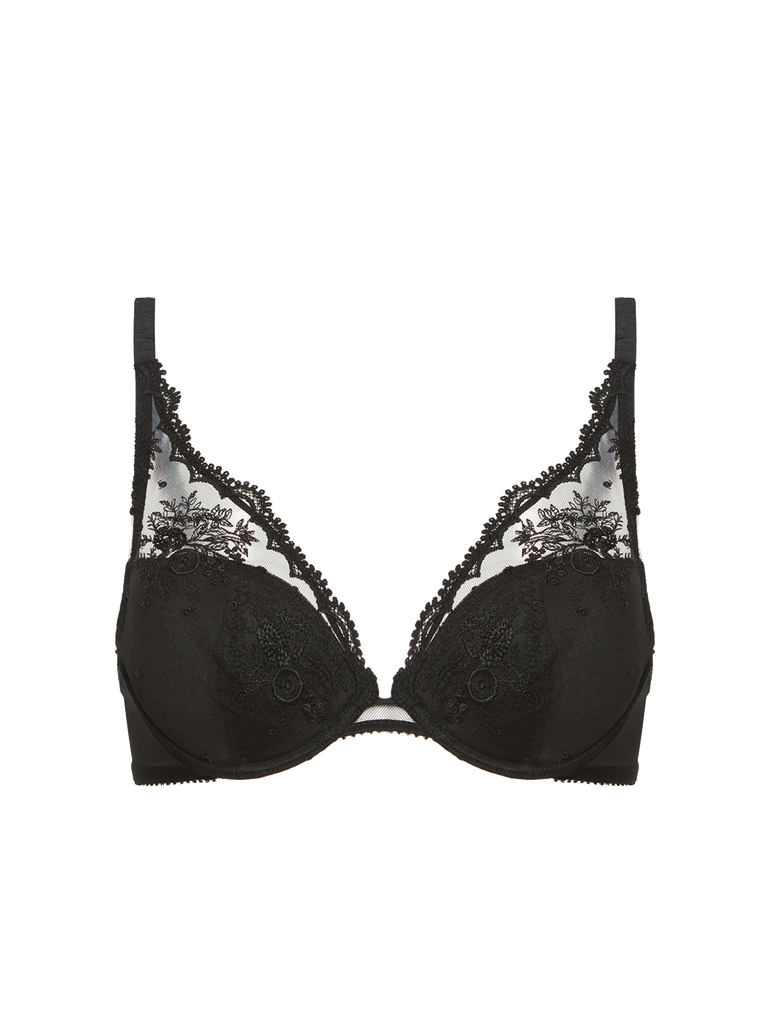 Your curves never looked as stylish as in the Intrigue Triangle Push Up Bra featuring a sophisticated pattern of elegant floral motifs embroidered on sheer tulle, this underwired bra delivers desk to date style and all-comfort in a cleavage boosting design. Easily customise your level of lift with removable foam pads and adjustable straps, whilst the plunging neckline is perfect for deep v-styles and this season’s fashion forward low-cut tops.