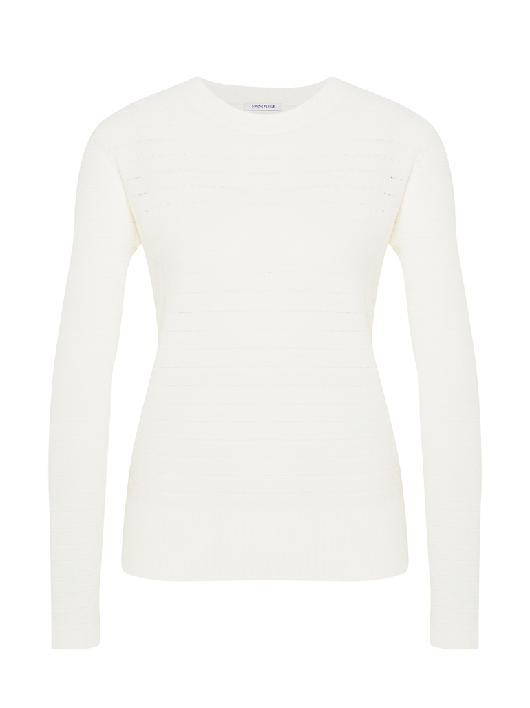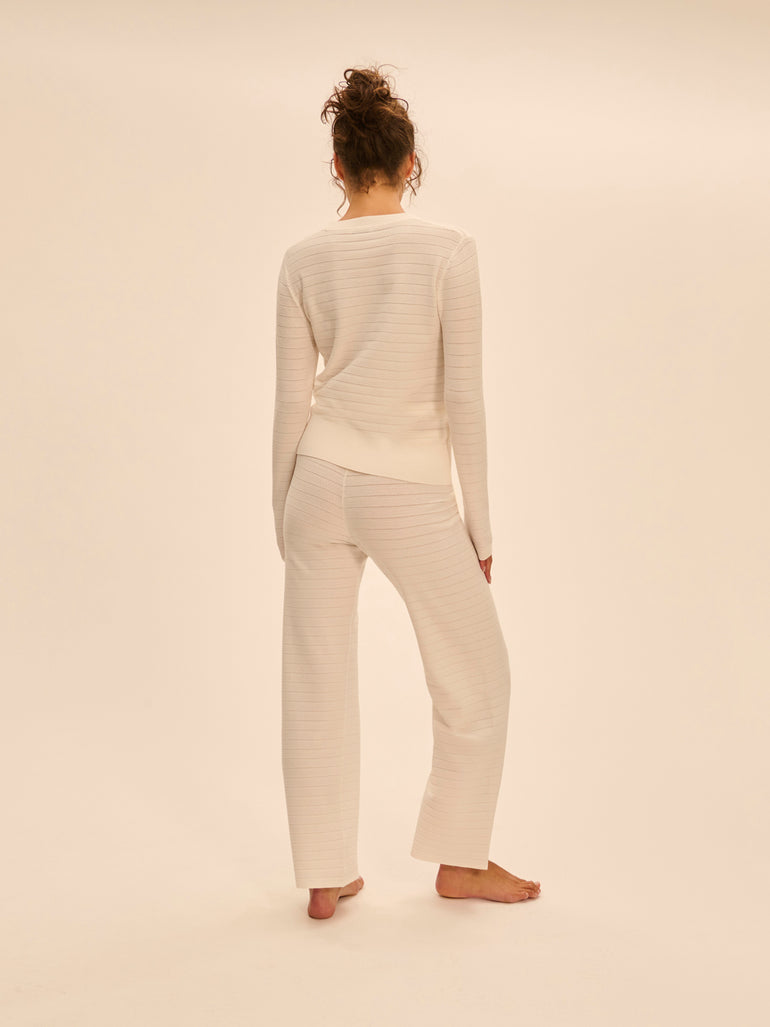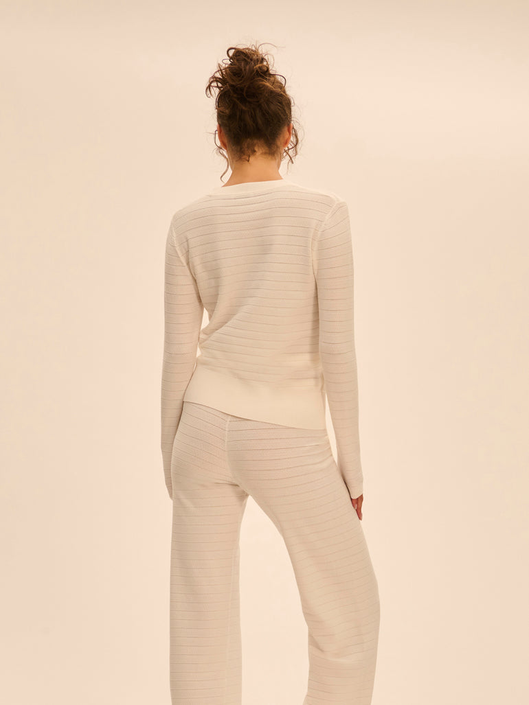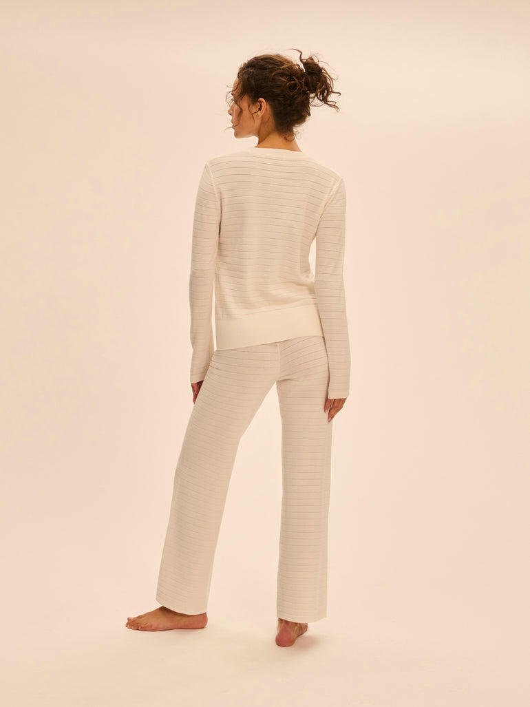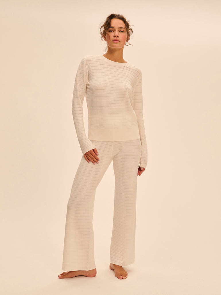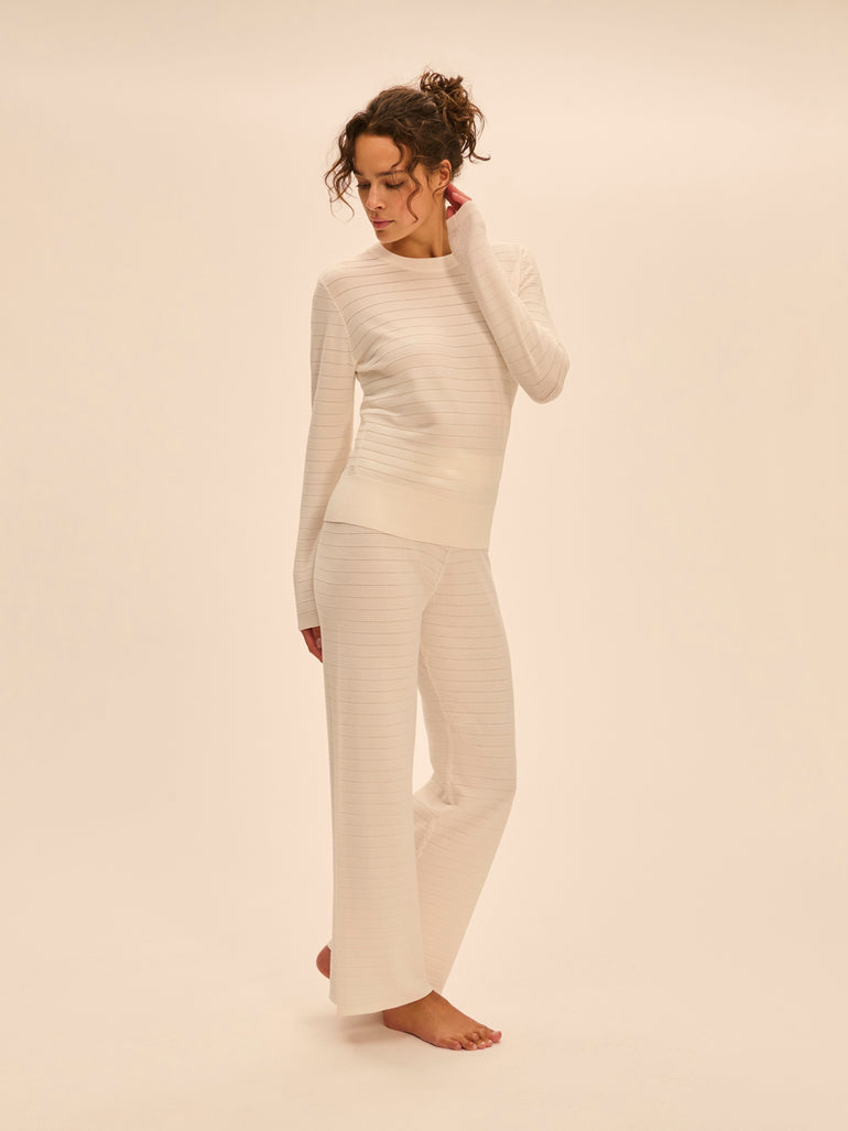 Relax in breathable, elegant comfort with the Pollen Loungewear Sweater. Made with LENZING™ ECOVERO™ viscose knit that sits close to your body, this lightweight sweater-style top offers the perfect balance of coverage and breathability. The delicate pointelle openwork detailing and cream colour are both subtle and seductive – so you can feel beautiful through slower days, dreamy nights and the serene moments in between. Pair this long-sleeve top with the Pollen night pants for a comfortable fit.