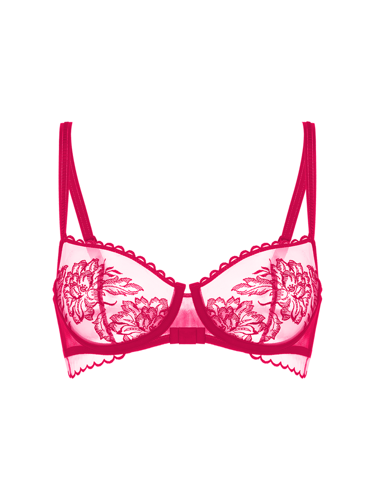 A modern ode to classic French lingerie. The Romance Half Cup Bra is crafted in cranberry sheer tulle and adorned with monochromatic floral embroidery, creating an artful design. The balconette shape enhances the bust with a rounded silhouette and lifted neckline, while scalloped edging and decorated straps complete the look. Made for an unforgettable impression.